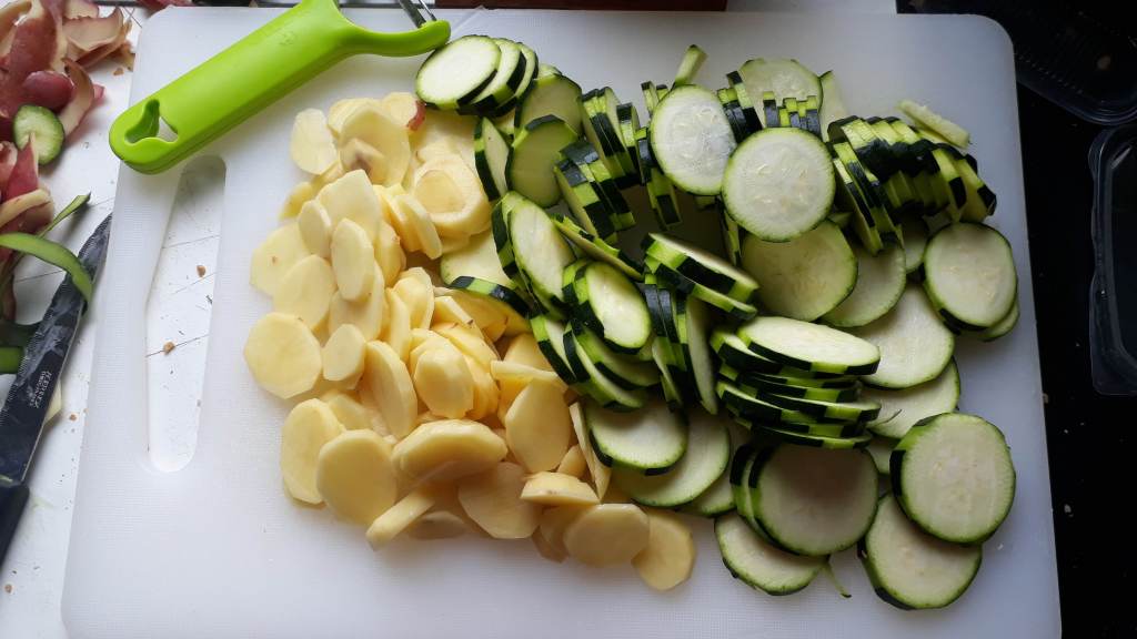 - Pendant ce temps là, peler et découper en rondelles les pommes de terre et les courgettes crues. Réserver.