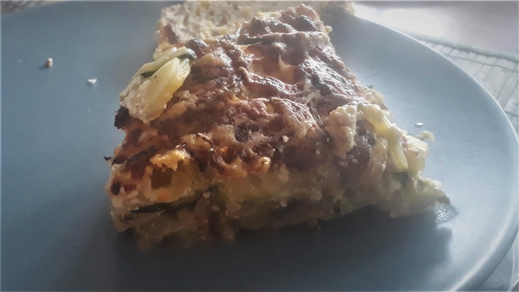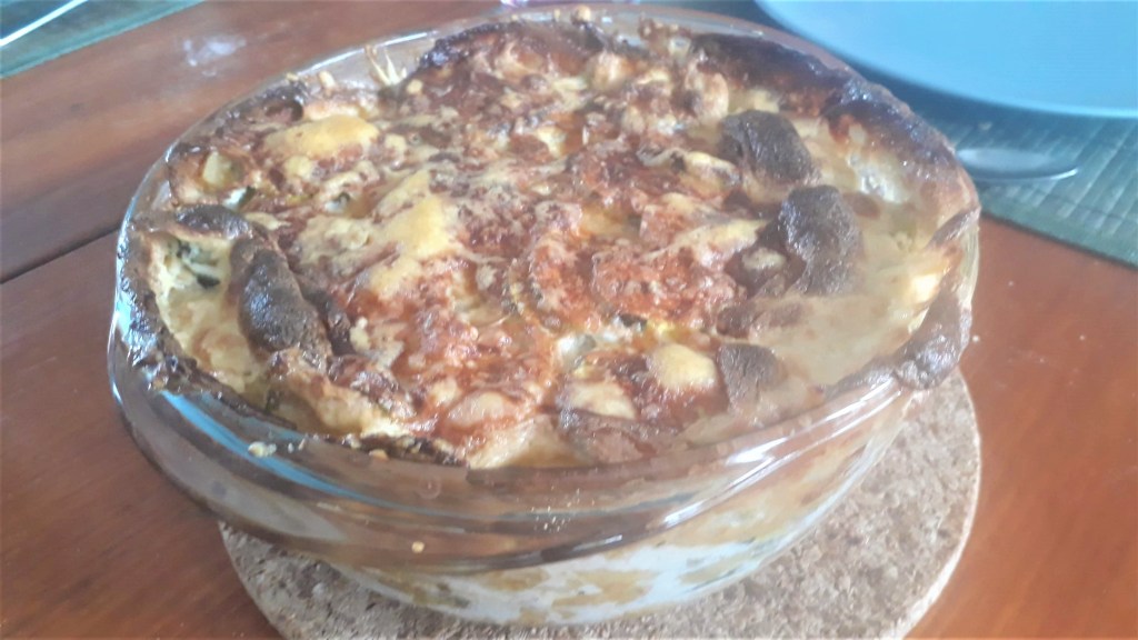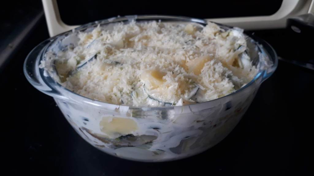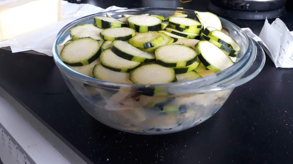 - Dans un plat à gratin préalablement beurré alterner une couche de courgette, une couche d’oignon et une couche de pomme de terre jusqu’à remplir le plat. Entre chaque couche verser un peu de crème assaisonnée, en veillant à terminer par de la crème.